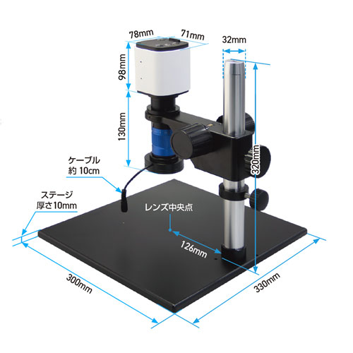 | 標準付属品 | カメラユニット、ACアダプタ-、HDMIケーブル、USBケーブル、ソフトウェアUSB、マウス、SDカード(カメラユニット装着済) 鏡筒、照明、照明用ACアダプタ-、調光ケーブル、ステージ、支柱、焦準装置、六角レンチ(3本) | |