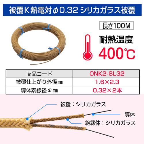 被覆K熱電対φ0.32シリカガラス被覆100m K32SL-100M