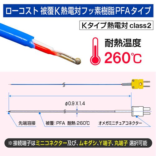コストを抑えたフッ素樹脂PFA被覆の先端溶接被覆K熱電対で耐熱は260℃。