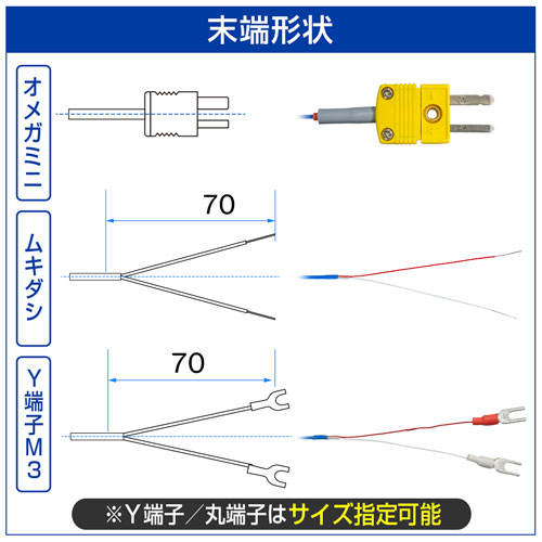 末端形状 | プラグ付/ムキダシ/Y端子(サイズ指定可能)/丸端子(サイズ指定可能) |