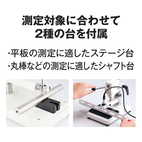 平板の測定に適したステージ台と、丸棒などの測定に適したシャフト台を用途に合わせて選択できます。