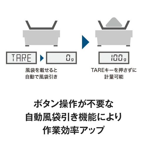 風袋を置くだけで自動で風袋引きを行う「自動風袋引き機能」や、計量結果を自動判定する「2種類のコンパレータ機能」を標準装備し、作業効率とヒューマンエラーのリスクを大幅に削減します。
