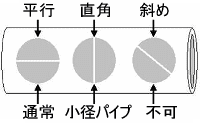 | 2点測定法 | 腐食の進行が予想される箇所では、2点測定法で測定 2点測定法とは、同一の測定点で、探触子の向きを90度変えて2回測定し、どちらかの薄い値を測定値として採用する方法 ![]() |