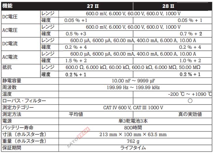 フルークFluke防水防塵マルチテスターFluke27Ⅱ/28Ⅱの仕様