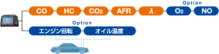 | 測定原理 | CO・HC・CO2:非分散赤外線吸収(NDIR)法 空燃比(AFR)、λ(LAMBDA): 標準 カーボンバランス法 O2計接続時 ブレットシュナイダ法(自動切替) |