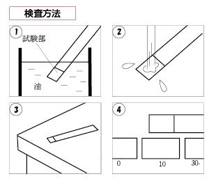 - 試験部表面の油を取り除いたら、流水から出して水を拭い、平たんな場所に20秒間置きます。