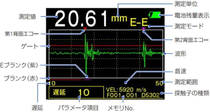 | 測定範囲 | E-E | 3.00 mm ~ 80.00 mm (D5302使用時、鋼の場合)