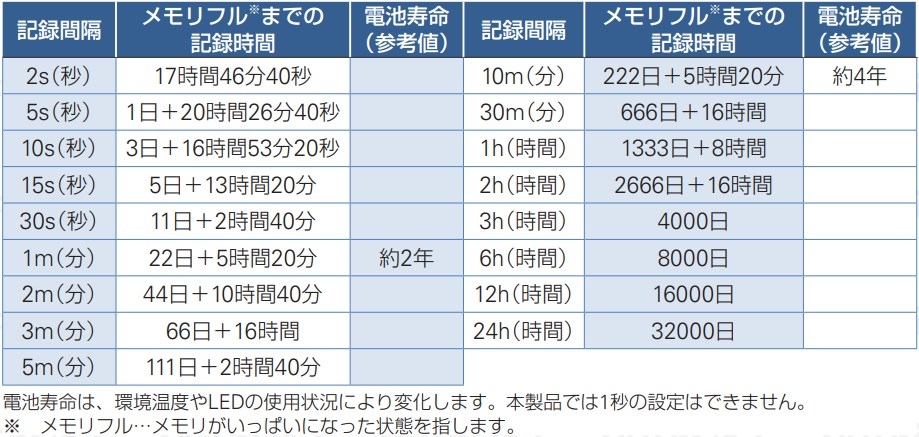 記録間隔10分で約4年 測定なしで約8年 (電池寿命は環境温度やLEDの使用状況により変化します) | |||