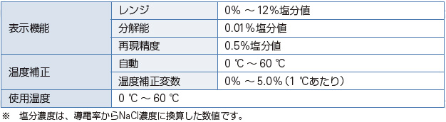 | 測定レンジ | 20 μS/cm、200 μS/cm、2 mS/cm、20 mS/cm、200 mS/cm |