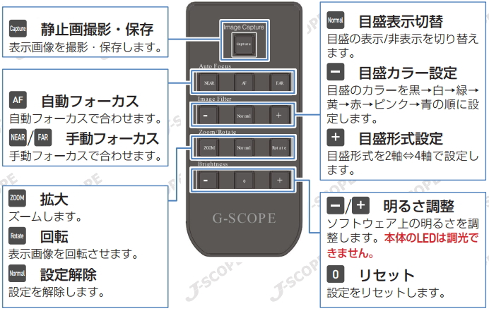 IRリモコンでスコープ本体に触れずに焦点、LEDライトの明るさ、ズームイン、ズームアウトなどの変更が可能。