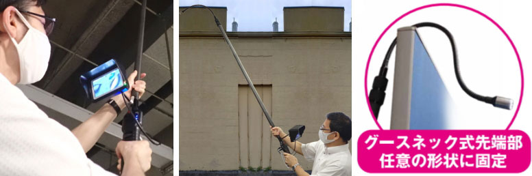 足場や脚立を使うことなく空調ダクトや上下水道、橋梁などを安全に点検できる伸縮ポールつき。