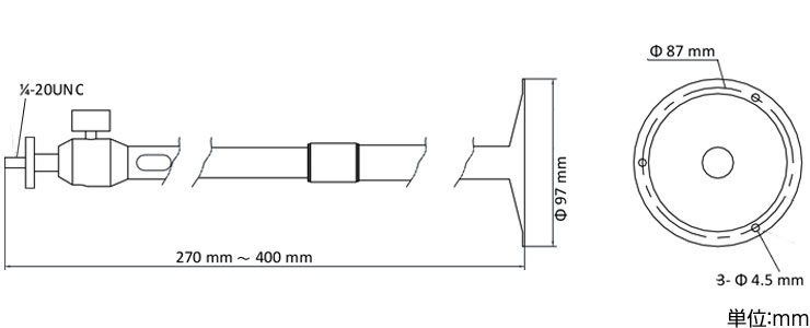 | 特長 | ■ 表面溶射処理を施したアルミニウム合金 / ■ 270mmから400mmまで伸縮可能 / ■ 屋内と屋外の両方に適用可能 |