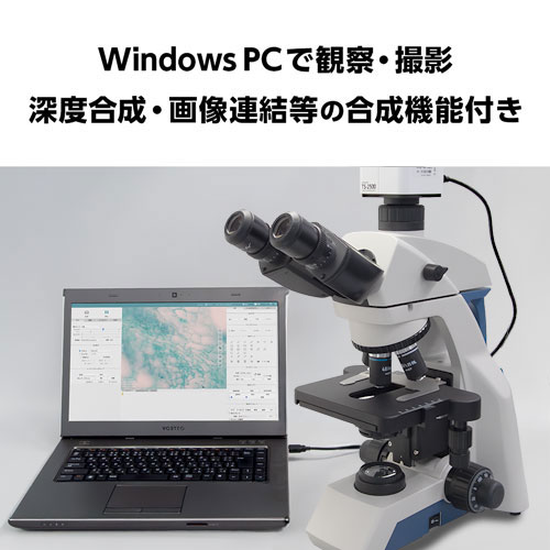 WindowsPCとUSB接続して接眼レンズを覗かず観察。無償提供の画像計測ソフトウェアで、写真・動画の撮影、観察像の直径・面積・角度等の計測、深度合成、画像連結等が可能です。