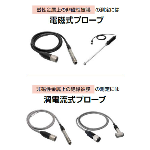 電磁式・渦電流式プローブの交換により多様な素材や被膜に対応。