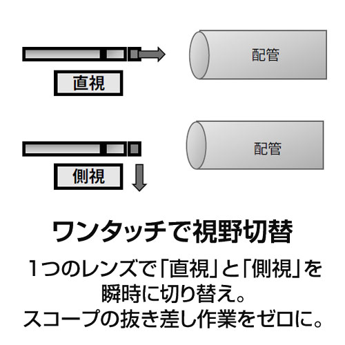 1つの光学アダプターで「直視/側視」や「近点/遠点」の切り替えが可能です。スコープの抜き差し回数を減らすことで、検査時間を短縮し、スコープの破損リスクも低減します。