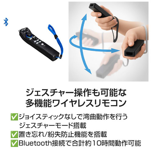 Bluetooth接続のリモコンにより、離れた場所からの操作や、ジョイスティックを使わない「ジェスチャーモード」での湾曲操作が可能です。