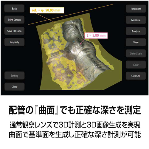 ■高度な3D計測能力:業界初、配管などの「曲面」も正確に深さを測れる「曲面基準計測」を搭載。