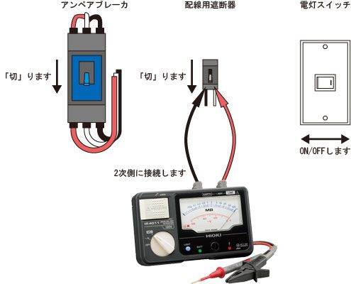 * 絶縁抵抗計を配線用遮断器に接続します。